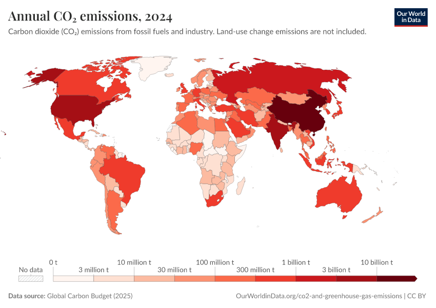 Which countries emit the most CO2 today? How do annual emissions vary across the world?