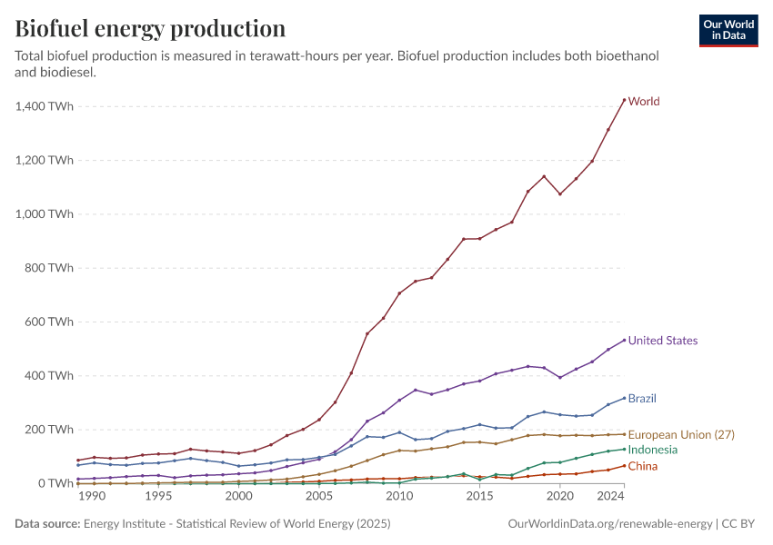 Most of the world’s biofuels come from sugarcane (mostly grown in Brazil), cereal crops such as corn (mostly grown in the United States and the European Union), and oil crops such as soybean and palm oil (which are grown in the US, Brazil, and Indonesia).