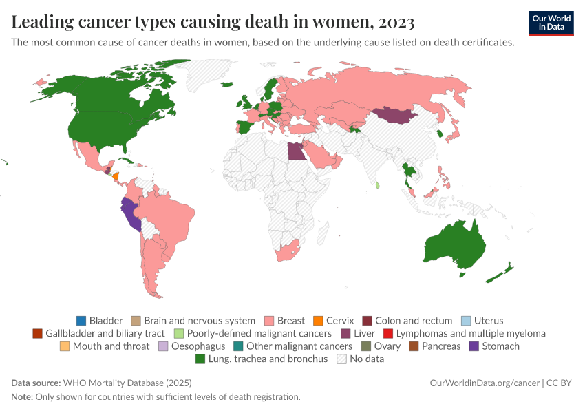 In women, the picture is different. Breast cancer is the most common cause of cancer death in women in many countries, but in others, lung, liver, and stomach cancer dominate.