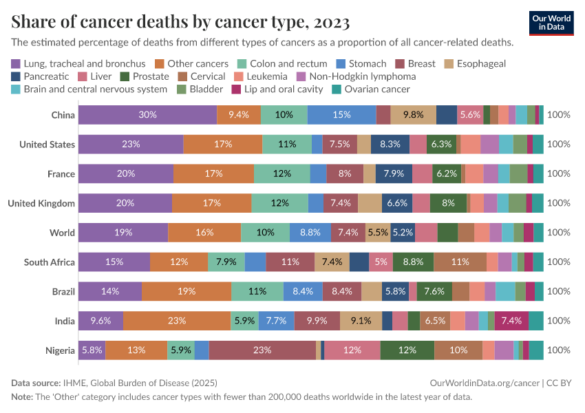 The share of cancer deaths from each type varies between countries. You can explore an interactive chart for different countries showing the relative share of all cancer deaths from each cancer type here: