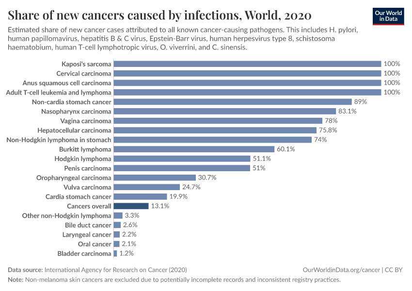 In total, it’s estimated that around 13% of all cancers worldwide were caused by infections in 2020.
