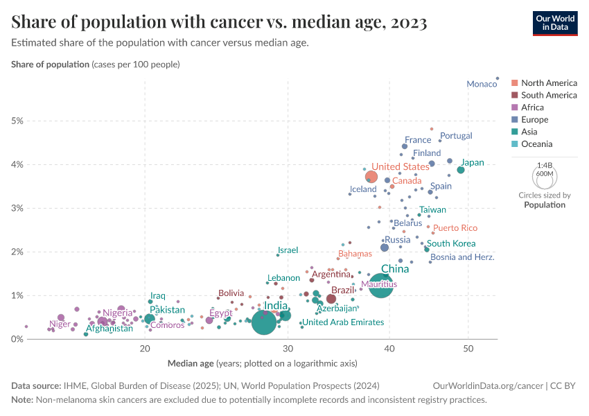 These factors mean that countries with older populations tend to have a higher prevalence of cancer. This is shown in the chart below.