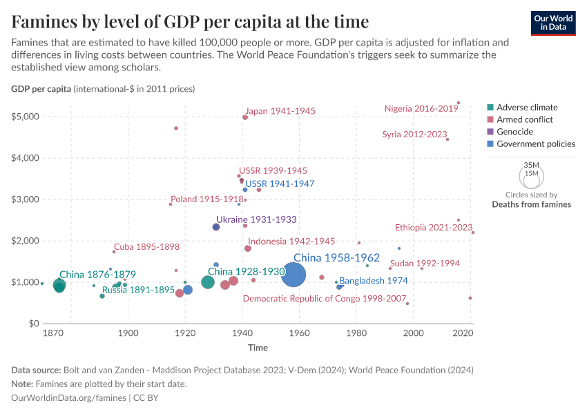 Our source, the World Peace Foundation, also identifies a main trigger for each famine. This data suggests that all famines in the slightly richer countries were not triggered by adverse climates, but human action in the form of bad government policies or armed conflict.