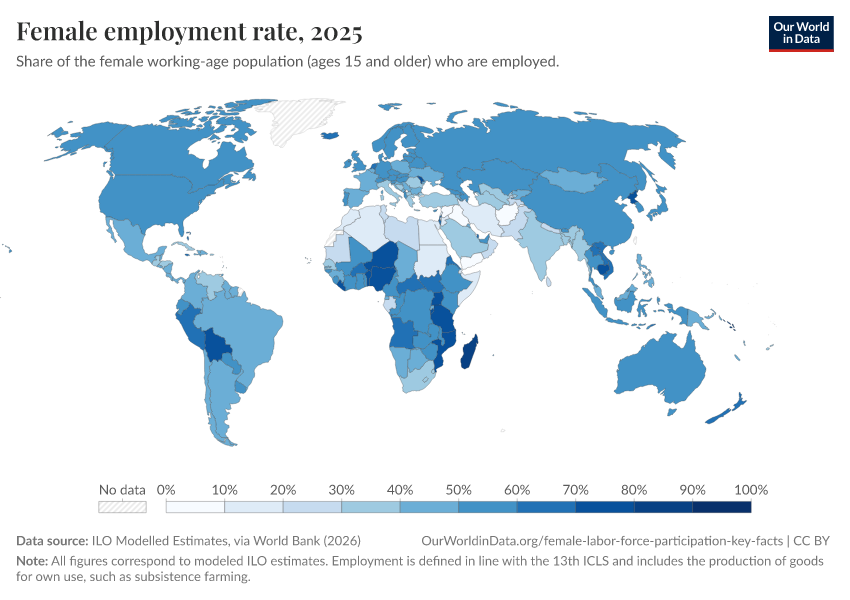 The chart here plots female employment-to-population ratios across the world (national estimates before ILO corrections). These figures show the number of employed women as a share of the total female working-age population (in both cases, for women ages 15 or older).