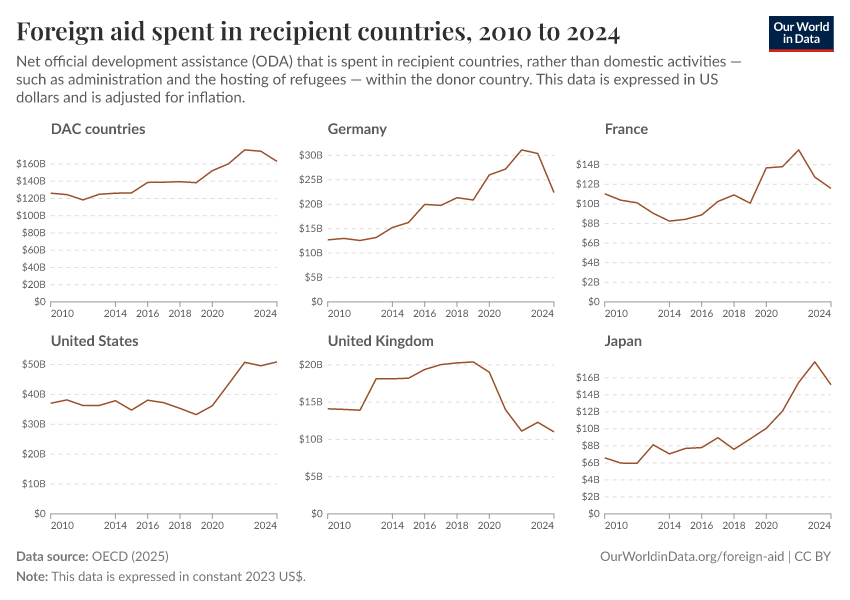 Simon van Teutem, Hannah Ritchie, and Pablo Arriagada (2025) - “How much foreign aid is spent domestically rather than overseas?” Published online at OurWorldinData.org. Retrieved from: 'https://data-archive-fasttrack-step.owid.pages.dev:8789/20260223-070107/foreign-aid-domestic-overseas.html' [Online Resource] (archived on February 23, 2026).BibTeX citation