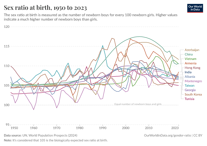 Most countries have a sex ratio at birth around the expected range of 105 boys born for every 100 girls.