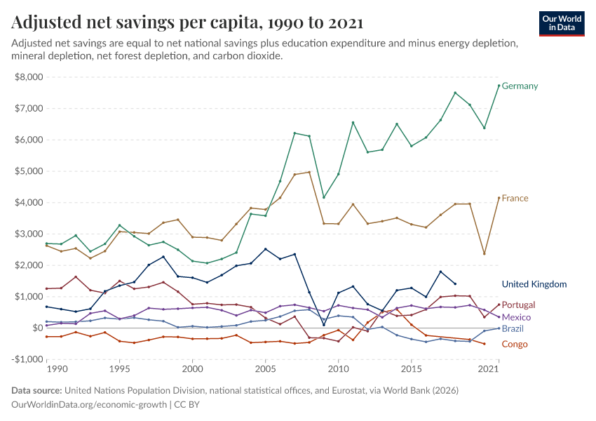 United Nations Population Division, national statistical offices, and Eurostat, via World Bank (2026) – processed by Our World in Data. “Adjusted net savings per capita” [dataset]. United Nations Population Division, national statistical offices, and Eurostat, via World Bank, “World Development Indicators 125” [original data]. Retrieved March 2, 2026 from https://data-archive-fasttrack-step.owid.pages.dev:8789/20260301-083443/grapher/adjusted-net-savings-per-person.html (archived on March 1, 2026).