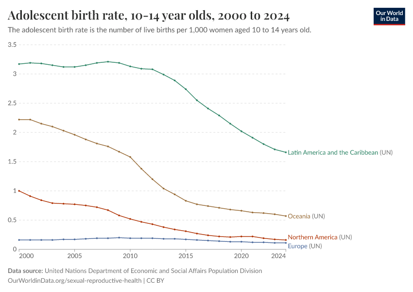 United Nations Department of Economic and Social Affairs Population Division – processed by Our World in Data. “Adolescent birth rate, 10-14 year olds” [dataset]. United Nations Department of Economic and Social Affairs Population Division, “Data from multiple sources” [original data]. Retrieved March 2, 2026 from https://data-archive-fasttrack-step.owid.pages.dev:8789/20260302-102641/grapher/adolescent-fertility.html (archived on March 2, 2026).