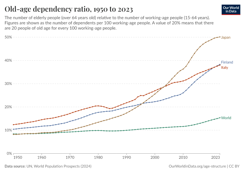 “Data Page: Old-age dependency ratio, age old”. Our World in Data (2026). Data adapted from United Nations. Retrieved from https://data-archive-fasttrack-step.owid.pages.dev:8789/20260225-004721/grapher/age-dependency-ratio-old.html [online resource] (archived on February 25, 2026).How to cite this data