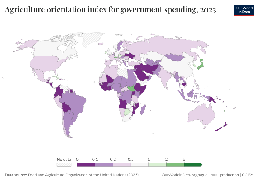 Food and Agriculture Organization of the United Nations (2025) – with major processing by Our World in Data. “2.a.1 agriculture orientation index for government expenditures - Value () – UN FAO” [dataset]. Food and Agriculture Organization of the United Nations, “SDG Indicators” [original data]. Retrieved March 2, 2026 from https://data-archive-fasttrack-step.owid.pages.dev:8789/20260226-122020/grapher/agriculture-orientation-index.html (archived on February 26, 2026).