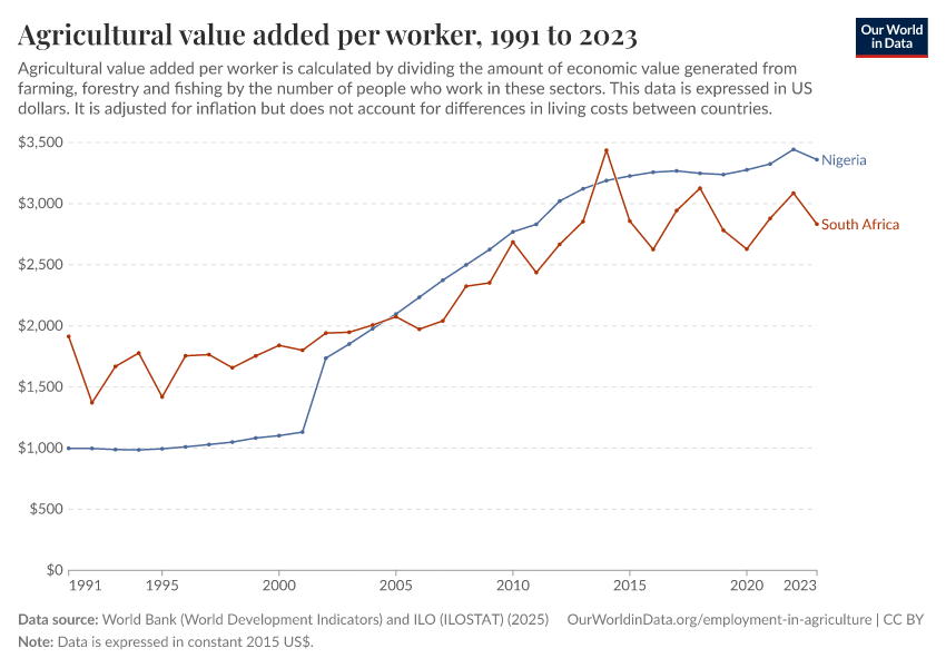 “Data Page: Agricultural value added per worker”. Our World in Data (2026). Data adapted from World Bank (World Development Indicators) and ILO (ILOSTAT). Retrieved from https://data-archive-fasttrack-step.owid.pages.dev:8789/20260129-125221/grapher/agriculture-value-added-per-worker-wdi.html [online resource] (archived on January 29, 2026).How to cite this data