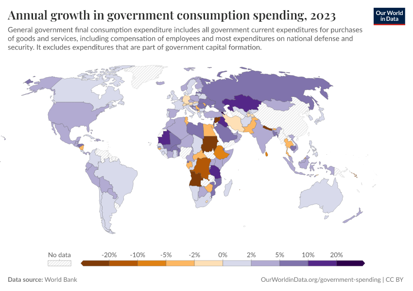 “Data Page: Annual growth in government consumption spending”. Our World in Data (2026). Data adapted from World Bank. Retrieved from https://data-archive-fasttrack-step.owid.pages.dev:8789/20260130-180113/grapher/annual-growth-of-general-government-final-consumption-expenditure.html [online resource] (archived on January 30, 2026).How to cite this data