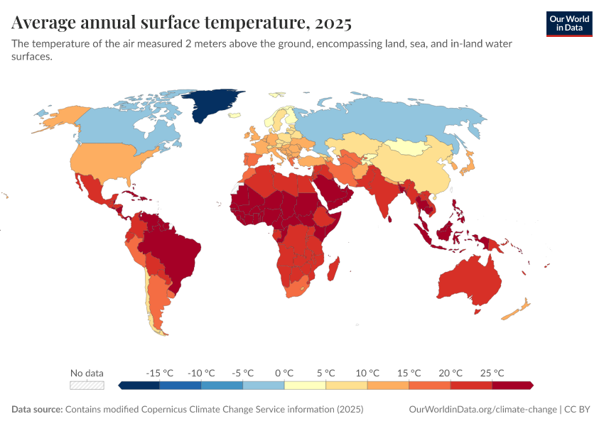 Contains modified Copernicus Climate Change Service information (2025) – with major processing by Our World in Data. “Average annual surface temperature” [dataset]. Contains modified Copernicus Climate Change Service information, “ERA5 monthly averaged data on single levels from 1940 to present 2” [original data]. Retrieved March 2, 2026 from https://data-archive-fasttrack-step.owid.pages.dev:8789/20260225-180245/grapher/average-annual-surface-temperature.html (archived on February 25, 2026).