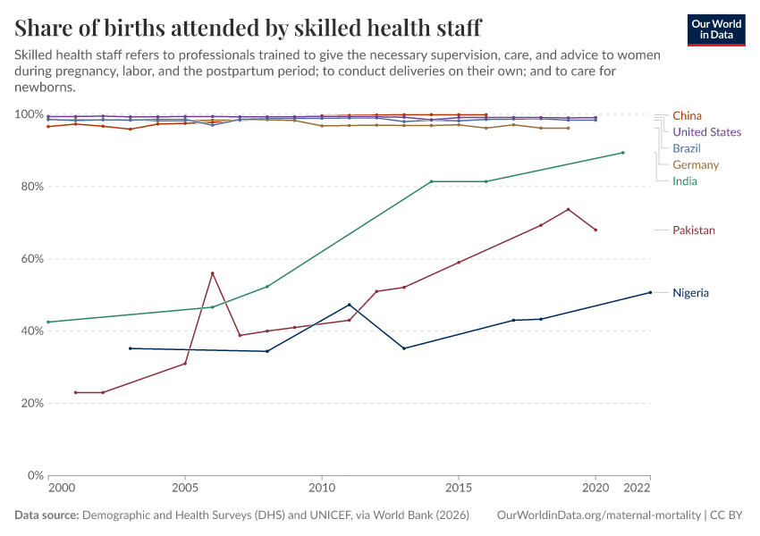 “Data Page: Share of births attended by skilled health staff”. Our World in Data (2026). Data adapted from Demographic and Health Surveys (DHS) and UNICEF, via World Bank. Retrieved from https://data-archive-fasttrack-step.owid.pages.dev:8789/20260301-083443/grapher/births-attended-by-health-staff-sdgs.html [online resource] (archived on March 1, 2026).