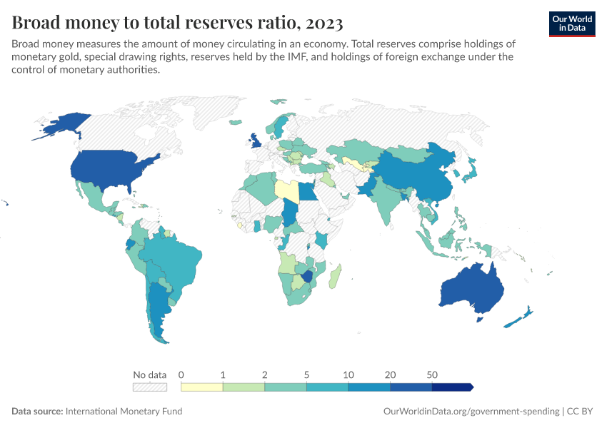 International Monetary Fund – processed by Our World in Data. “Broad money to total reserves ratio” [dataset]. International Monetary Fund, “International Monetary Fund, International Financial Statistics and data files.” [original data]. Retrieved March 2, 2026 from https://data-archive-fasttrack-step.owid.pages.dev:8789/20251120-211749/grapher/broad-money-to-total-reserves-ratio.html (archived on November 20, 2025).