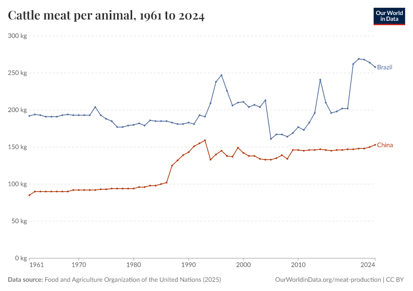“Data Page: Cattle meat yield per animal”, part of the following publication: Hannah Ritchie, Pablo Rosado, and Max Roser (2023) - “Agricultural Production”. Data adapted from Food and Agriculture Organization of the United Nations. Retrieved from https://data-archive-fasttrack-step.owid.pages.dev:8789/20260226-122020/grapher/cattle-meat-yields-hectograms-100-grams-per-animal.html [online resource] (archived on February 26, 2026).