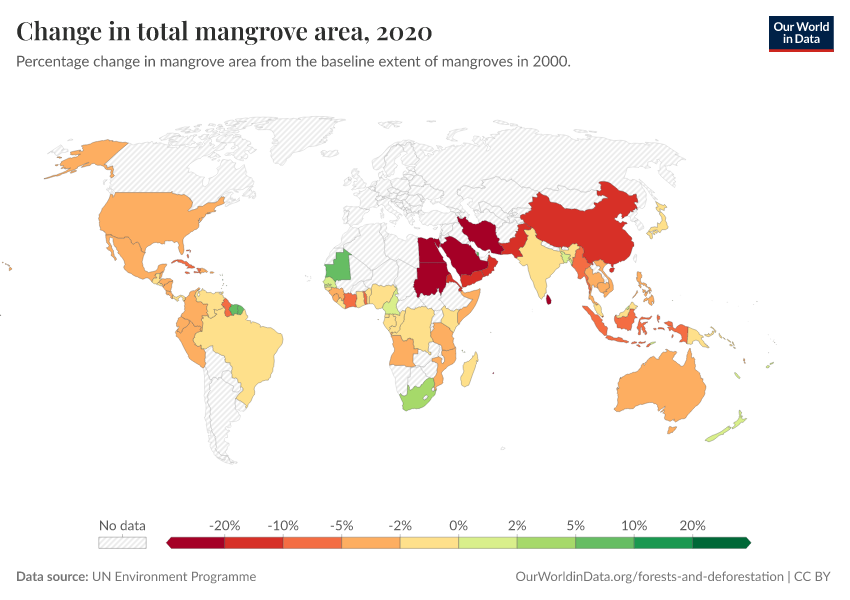 “Data Page: Change in total mangrove area”. Our World in Data (2026). Data adapted from UN Environment Programme. Retrieved from https://data-archive-fasttrack-step.owid.pages.dev:8789/20260130-180113/grapher/change-in-total-mangrove-area.html [online resource] (archived on January 30, 2026).How to cite this data
