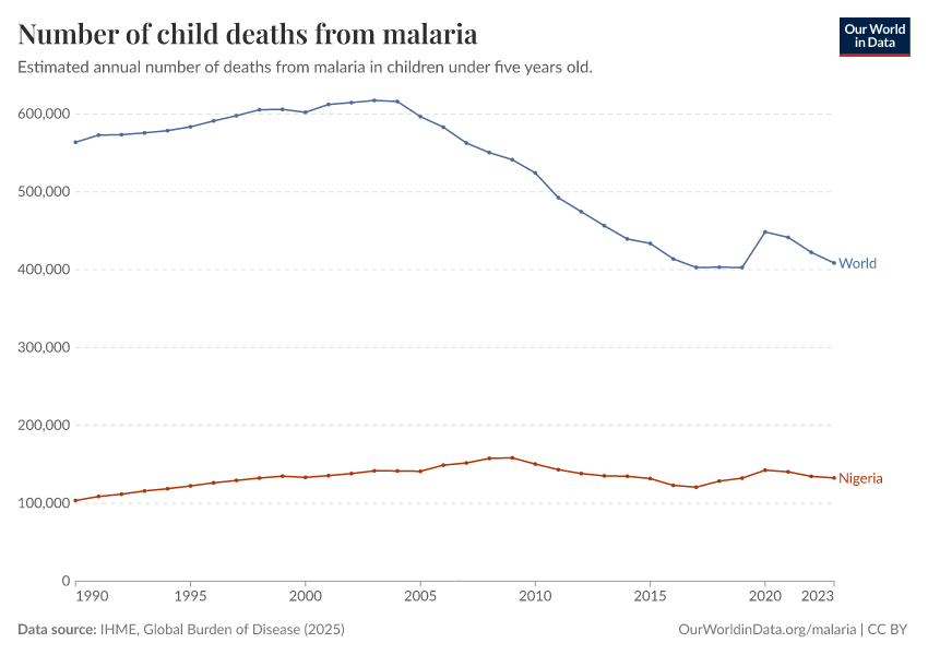 IHME, Global Burden of Disease (2025) – with major processing by Our World in Data. “Number of child deaths from malaria” [dataset]. IHME, Global Burden of Disease, “Global Burden of Disease - Deaths” [original data]. Retrieved March 2, 2026 from https://data-archive-fasttrack-step.owid.pages.dev:8789/20260211-174736/grapher/child-deaths-from-malaria-number.html (archived on February 11, 2026).