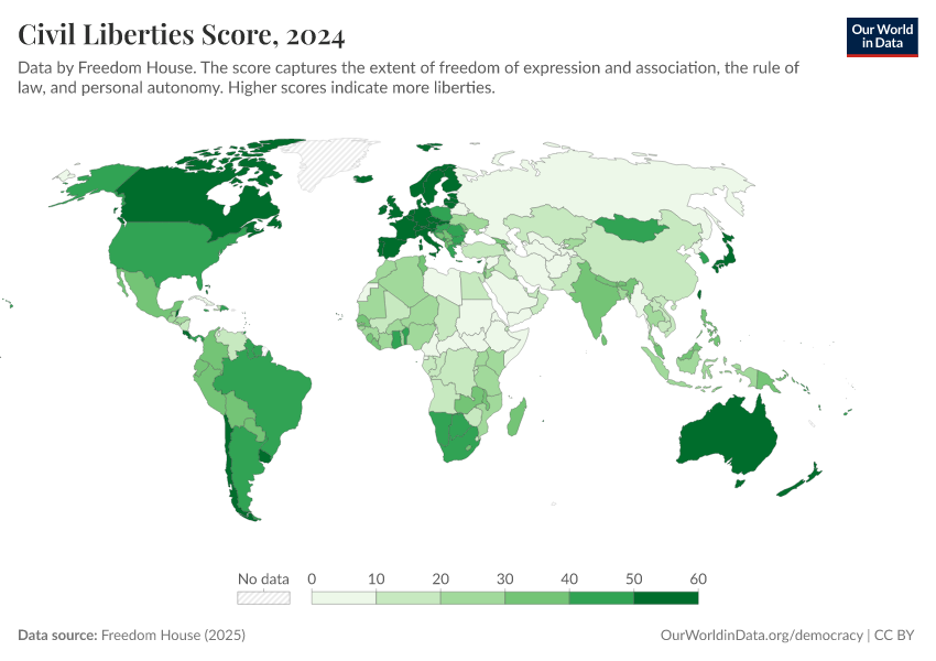 Freedom House (2025) – processed by Our World in Data. “Civil Liberties Score” [dataset]. Freedom House, “Freedom in the World” [original data]. Retrieved March 2, 2026 from https://data-archive-fasttrack-step.owid.pages.dev:8789/20260204-170225/grapher/civil-liberties-score-fh.html (archived on February 4, 2026).