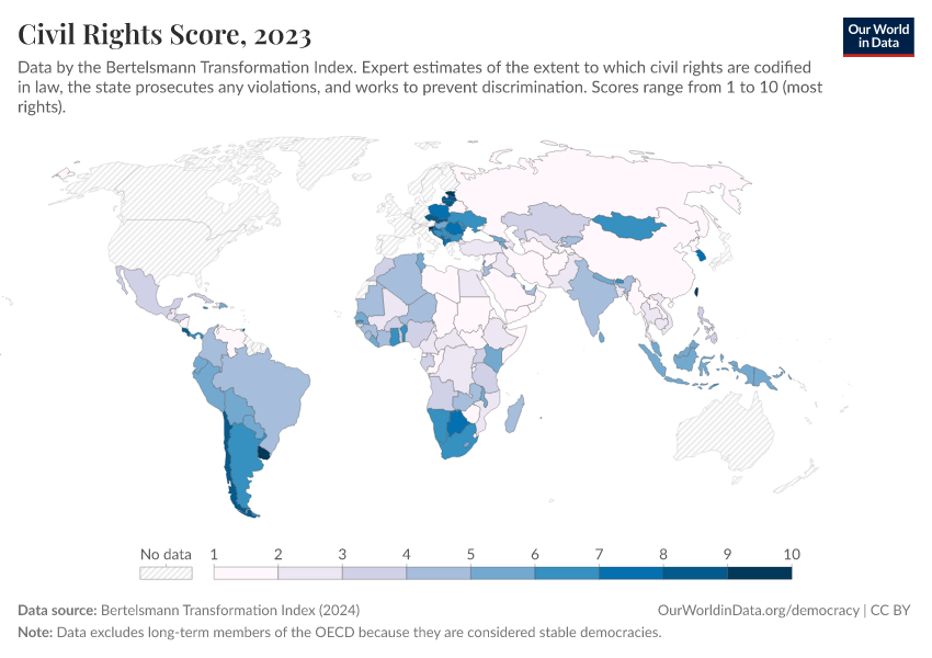 Bertelsmann Transformation Index (2024) – processed by Our World in Data. “Civil Rights Score” [dataset]. Bertelsmann Transformation Index, “Bertelsmann Transformation Index, Scores” [original data]. Retrieved March 2, 2026 from https://data-archive-fasttrack-step.owid.pages.dev:8789/20260204-165456/grapher/civil-rights-score-bti.html (archived on February 4, 2026).