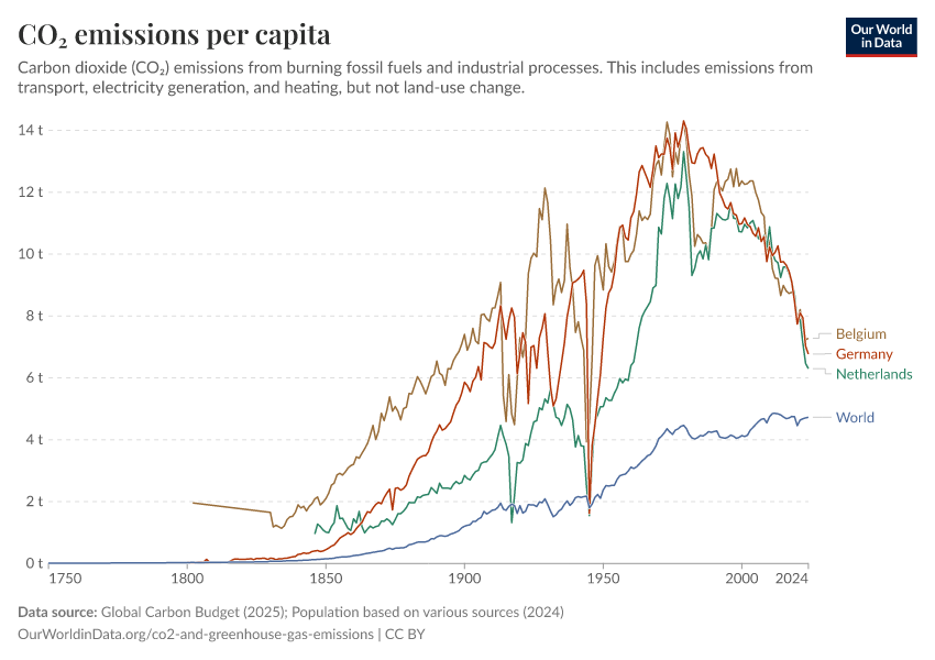 “Data Page: CO₂ emissions per capita”, part of the following publication: Hannah Ritchie, Pablo Rosado, and Max Roser (2023) - “CO₂ and Greenhouse Gas Emissions”. Data adapted from Global Carbon Project, Various sources. Retrieved from https://data-archive-fasttrack-step.owid.pages.dev:8789/20260119-070102/grapher/co-emissions-per-capita.html [online resource] (archived on January 19, 2026).How to cite this data