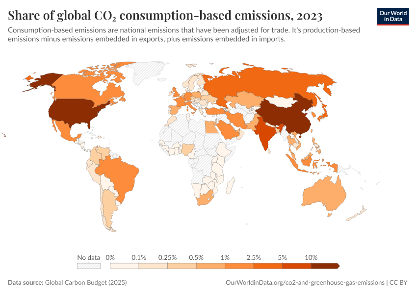 “Data Page: Share of global CO₂ consumption-based emissions”, part of the following publication: Hannah Ritchie, Pablo Rosado, and Max Roser (2023) - “CO₂ and Greenhouse Gas Emissions”. Data adapted from Global Carbon Project. Retrieved from https://data-archive-fasttrack-step.owid.pages.dev:8789/20260119-070102/grapher/co2-consumption-share.html [online resource] (archived on January 19, 2026).How to cite this data