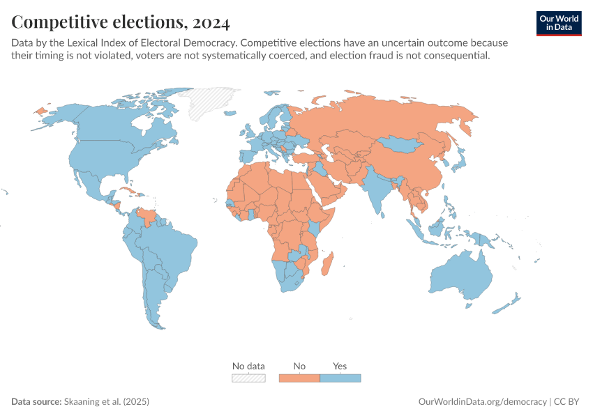 Skaaning et al. (2025) – processed by Our World in Data. “Competitive elections” [dataset]. Skaaning et al., “Lexical Index of Electoral Democracy (LIED) v6.8” [original data]. Retrieved March 2, 2026 from https://data-archive-fasttrack-step.owid.pages.dev:8789/20260119-065148/grapher/competitive-elections-lexical.html (archived on January 19, 2026).