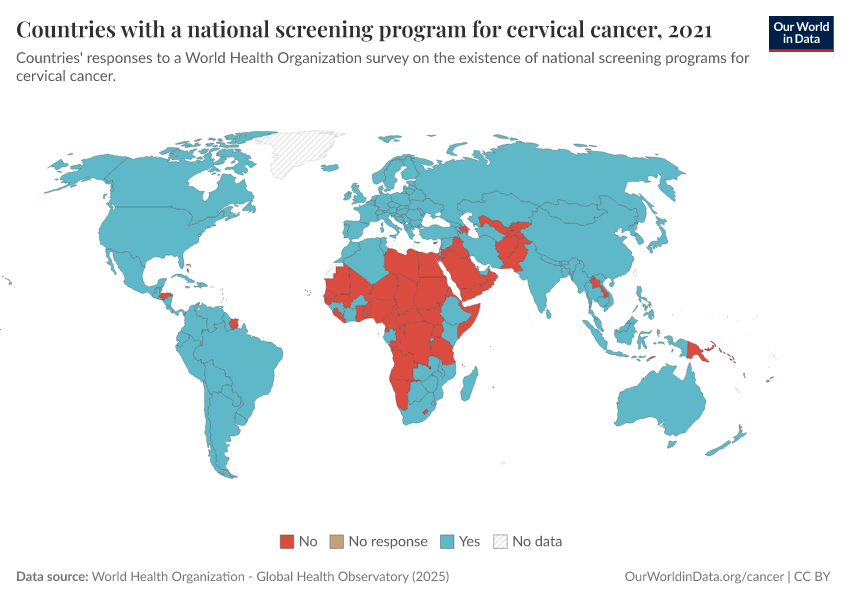 “Data Page: Countries with a national screening program for cervical cancer”. Our World in Data (2026). Data adapted from World Health Organization. Retrieved from https://data-archive-fasttrack-step.owid.pages.dev:8789/20260224-141219/grapher/countries-with-national-cervical-cancer-screening-program.html [online resource] (archived on February 24, 2026).How to cite this data