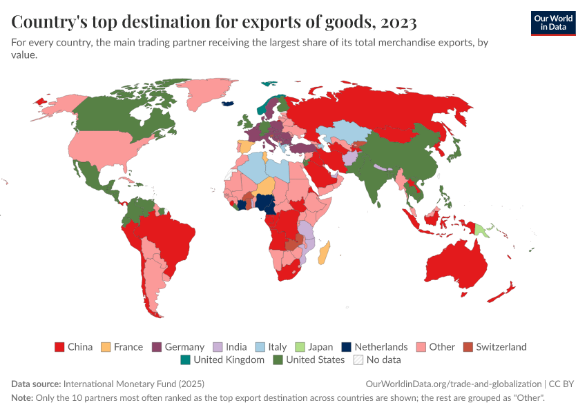 International Monetary Fund (2025) – with major processing by Our World in Data. “Top export partner category” [dataset]. International Monetary Fund, “International Trade in Goods (by partner country) (IMTS)” [original data]. Retrieved March 2, 2026 from https://data-archive-fasttrack-step.owid.pages.dev:8789/20251114-012441/grapher/countrys-top-destination-for-exports-of-goods.html (archived on November 14, 2025).