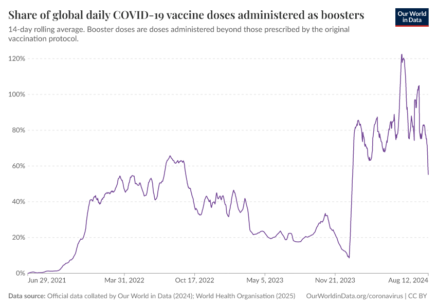 Official data collated by Our World in Data (2024); World Health Organisation (2025) – with major processing by Our World in Data. “Share of global daily COVID-19 vaccine doses administered as boosters” [dataset]. Official data collated by Our World in Data, “COVID-19, vaccinations”; World Health Organisation, “COVID-19, vaccinations (WHO)” [original data]. Retrieved March 2, 2026 from https://data-archive-fasttrack-step.owid.pages.dev:8789/20250909-093708/grapher/covid-vaccine-share-boosters.html (archived on September 9, 2025).