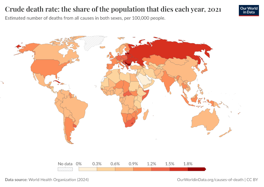 World Health Organization (2024) – with major processing by Our World in Data. “Crude death rate: the share of the population that dies each year” [dataset]. World Health Organization, “Global Health Estimates” [original data]. Retrieved March 2, 2026 from https://data-archive-fasttrack-step.owid.pages.dev:8789/20250909-093708/grapher/crude-death-rate-the-share-of-the-population-that-dies-each-year-who.html (archived on September 9, 2025).