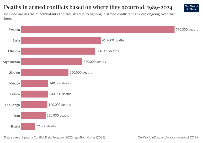 Uppsala Conflict Data Program (2023); Natural Earth (2022) – processed by Our World in Data. “Deaths in armed conflicts based on where they occurred, 1989-2024” [dataset]. Uppsala Conflict Data Program, “Georeferenced Event Dataset (cumulative)”; Natural Earth, “Large scale data (1:10m Cultural Vectors), Admin 0 Countries 5.1.1” [original data]. Retrieved March 2, 2026 from https://data-archive-fasttrack-step.owid.pages.dev:8789/20250909-093708/grapher/cumulative-deaths-in-armed-conflicts.html (archived on September 9, 2025).