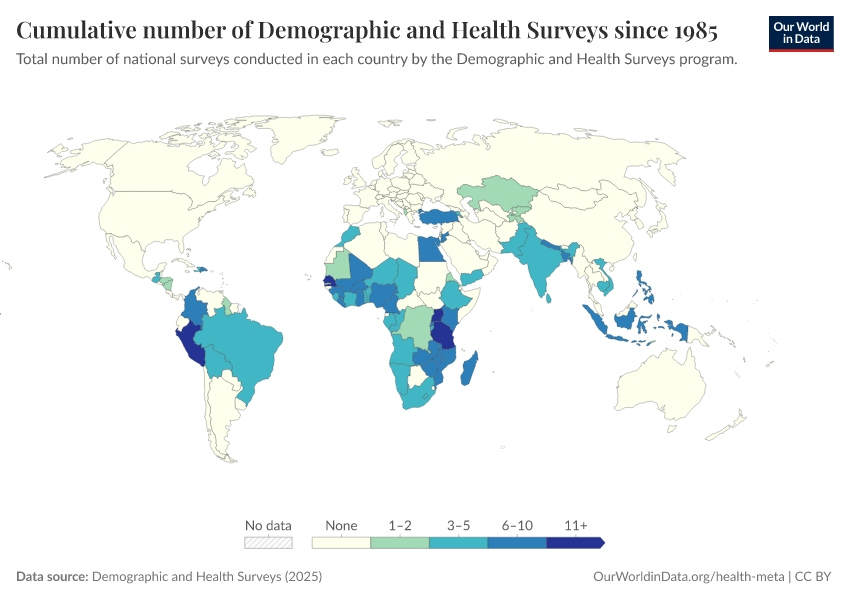 “Data Page: Cumulative number of Demographic and Health Surveys since 1985”. Our World in Data (2026). Data adapted from Demographic and Health Surveys. Retrieved from https://data-archive-fasttrack-step.owid.pages.dev:8789/20250909-093708/grapher/cumulative-number-of-dhs-surveys-conducted.html [online resource] (archived on September 9, 2025).How to cite this data