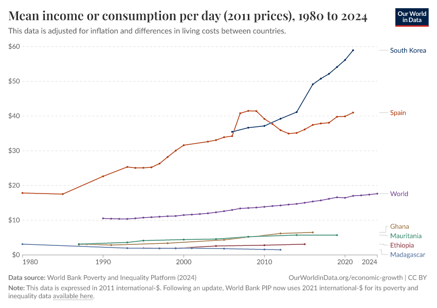 World Bank Poverty and Inequality Platform (2024) – with major processing by Our World in Data. “Mean income or consumption per day (2011 prices) – World Bank” [dataset]. World Bank Poverty and Inequality Platform, “World Bank Poverty and Inequality Platform (PIP) 20240627_2017, 20240627_2011” [original data]. Retrieved March 2, 2026 from https://data-archive-fasttrack-step.owid.pages.dev:8789/20251022-091218/grapher/daily-mean-income-2011-ppp.html (archived on October 22, 2025).