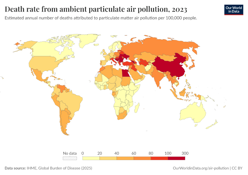 IHME, Global Burden of Disease (2025) – with major processing by Our World in Data. “Death rate from ambient particulate air pollution” [dataset]. IHME, Global Burden of Disease, “Global Burden of Disease - Risk Factors - Deaths” [original data]. Retrieved March 2, 2026 from https://data-archive-fasttrack-step.owid.pages.dev:8789/20260213-112438/grapher/death-rate-from-ambient-particulate-air-pollution.html (archived on February 13, 2026).