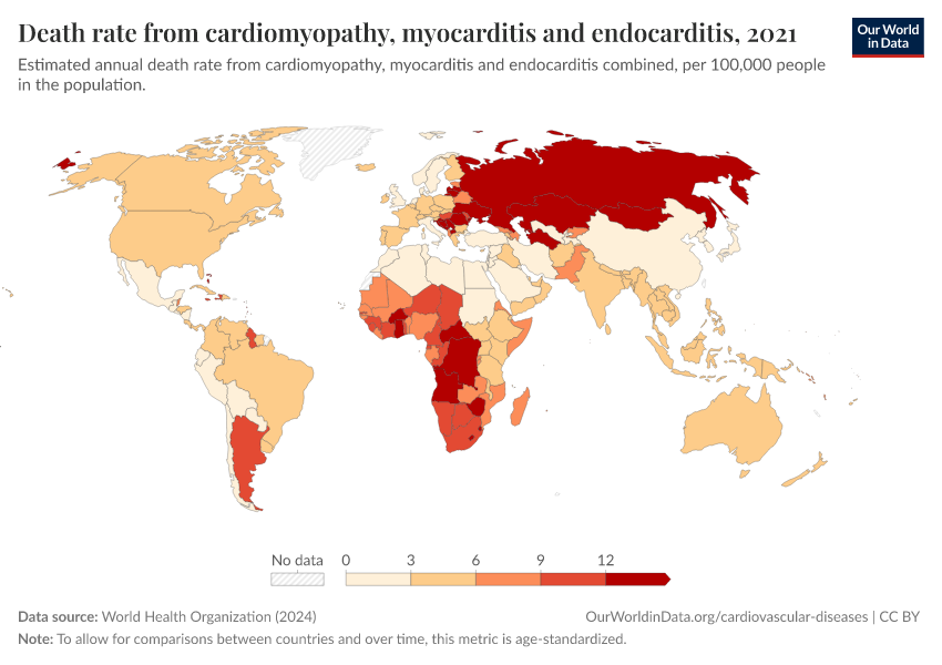 “Data Page: Death rate from cardiomyopathy, myocarditis and endocarditis”, part of the following publication: Esteban Ortiz-Ospina and Max Roser (2016) - “Global Health”. Data adapted from World Health Organization. Retrieved from https://data-archive-fasttrack-step.owid.pages.dev:8789/20250909-093708/grapher/death-rate-from-cardiomyopathy-myocarditis-endocarditis-who-ghe-age-standardized.html [online resource] (archived on September 9, 2025).How to cite this data