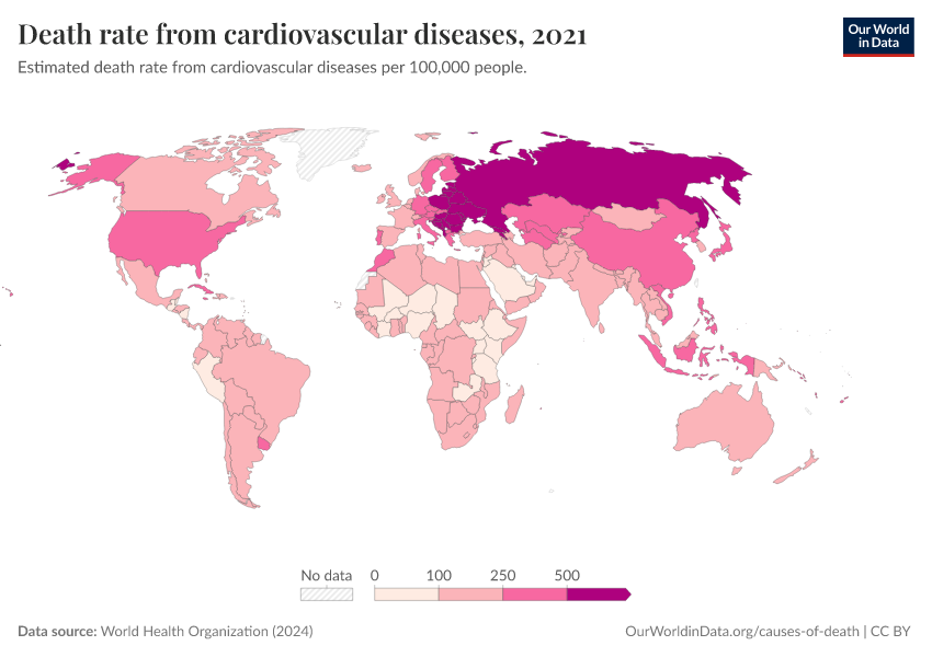 World Health Organization (2024) – with major processing by Our World in Data. “Death rate from cardiovascular diseases” [dataset]. World Health Organization, “Global Health Estimates” [original data]. Retrieved March 2, 2026 from https://data-archive-fasttrack-step.owid.pages.dev:8789/20250909-093708/grapher/death-rate-from-cardiovascular-disease-ghe.html (archived on September 9, 2025).