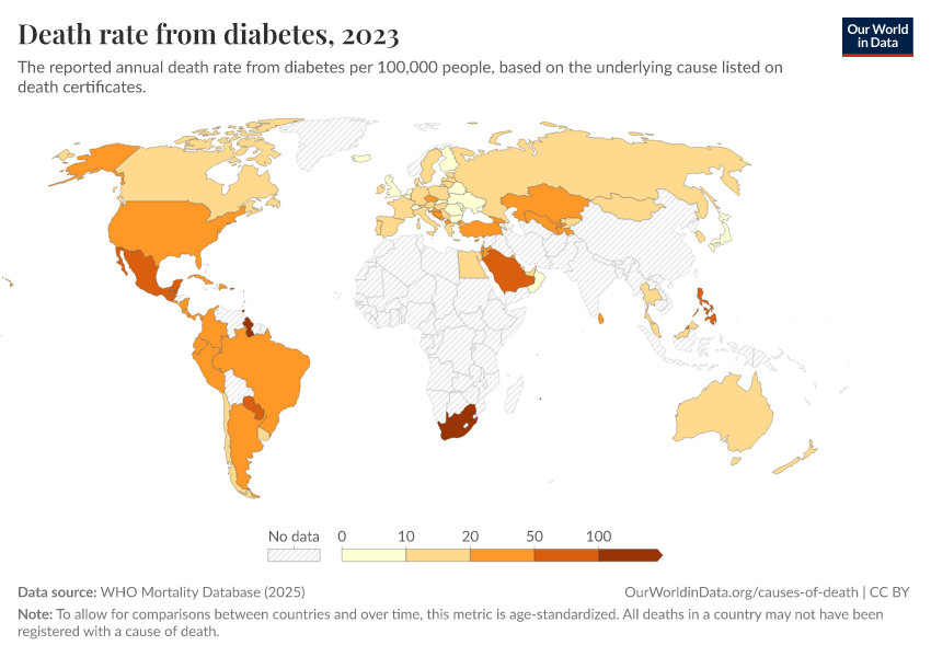 WHO Mortality Database (2025) – with minor processing by Our World in Data. “Death rate from diabetes” [dataset]. WHO Mortality Database, “WHO Mortality Database” [original data]. Retrieved March 2, 2026 from https://data-archive-fasttrack-step.owid.pages.dev:8789/20250909-093708/grapher/death-rate-from-diabetes-who-mdb.html (archived on September 9, 2025).