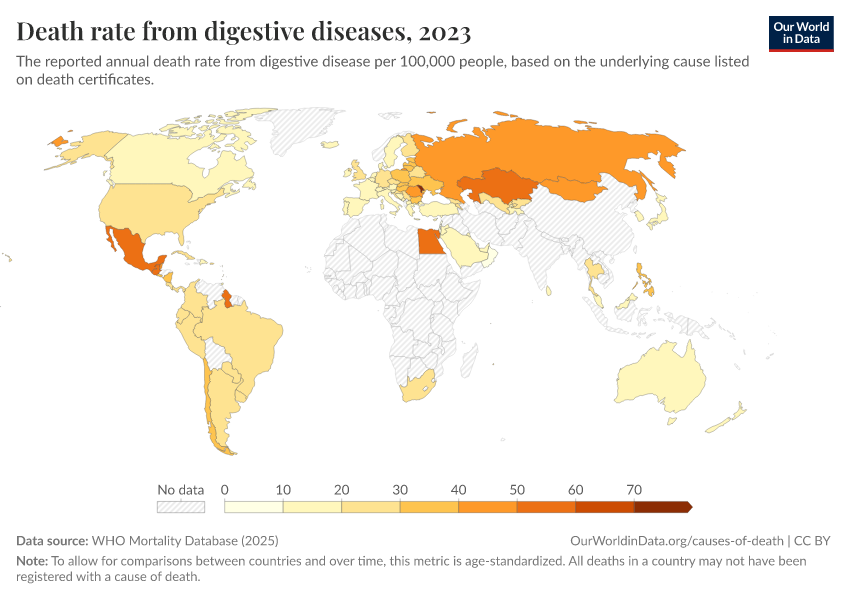 “Data Page: Death rate from digestive diseases”, part of the following publication: Saloni Dattani, Fiona Spooner, Hannah Ritchie, and Max Roser (2023) - “Causes of Death”. Data adapted from WHO Mortality Database. Retrieved from https://data-archive-fasttrack-step.owid.pages.dev:8789/20250909-093708/grapher/death-rate-from-digestive-diseases-who-mdb.html [online resource] (archived on September 9, 2025).How to cite this data