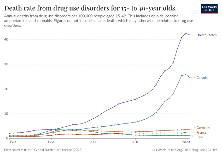 IHME, Global Burden of Disease (2025) – with major processing by Our World in Data. “Death rate from drug use disorders for 15- to 49-year olds” [dataset]. IHME, Global Burden of Disease, “Global Burden of Disease - Deaths” [original data]. Retrieved March 2, 2026 from https://data-archive-fasttrack-step.owid.pages.dev:8789/20260211-174736/grapher/death-rate-from-drug-use-disorders-for-15--to-49-year-olds.html (archived on February 11, 2026).