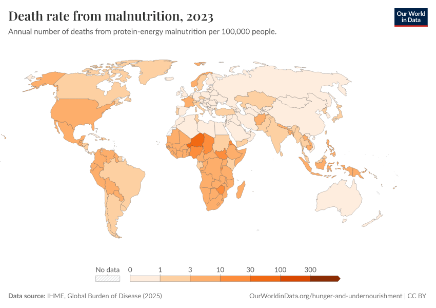 IHME, Global Burden of Disease (2025) – with major processing by Our World in Data. “Death rate from malnutrition” [dataset]. IHME, Global Burden of Disease, “Global Burden of Disease - Deaths” [original data]. Retrieved March 2, 2026 from https://data-archive-fasttrack-step.owid.pages.dev:8789/20260211-174736/grapher/death-rate-from-malnutrition.html (archived on February 11, 2026).