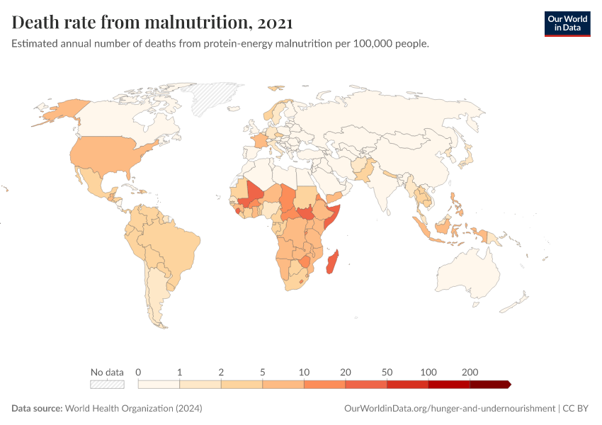 World Health Organization (2024) – with major processing by Our World in Data. “Death rate from malnutrition” [dataset]. World Health Organization, “Global Health Estimates” [original data]. Retrieved March 2, 2026 from https://data-archive-fasttrack-step.owid.pages.dev:8789/20250909-093708/grapher/death-rate-from-malnutrition-ghe.html (archived on September 9, 2025).