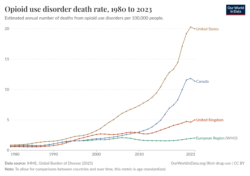 IHME, Global Burden of Disease (2025) – with major processing by Our World in Data. “Opioid use disorder death rate” [dataset]. IHME, Global Burden of Disease, “Global Burden of Disease - Deaths” [original data]. Retrieved March 2, 2026 from https://data-archive-fasttrack-step.owid.pages.dev:8789/20260211-174736/grapher/death-rate-from-opioid-use.html (archived on February 11, 2026).