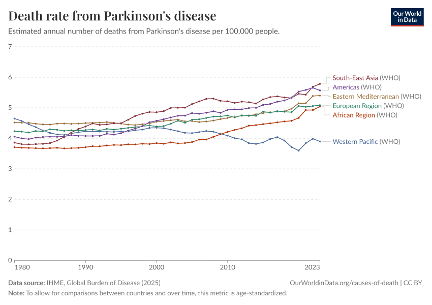 IHME, Global Burden of Disease (2025) – with major processing by Our World in Data. “Death rate from Parkinson's disease” [dataset]. IHME, Global Burden of Disease, “Global Burden of Disease - Deaths” [original data]. Retrieved March 2, 2026 from https://data-archive-fasttrack-step.owid.pages.dev:8789/20260211-174736/grapher/death-rate-from-parkinsons-disease.html (archived on February 11, 2026).
