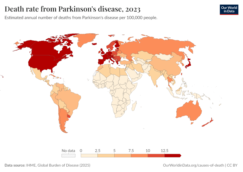 IHME, Global Burden of Disease (2025) – with major processing by Our World in Data. “Death rate from Parkinson's disease” [dataset]. IHME, Global Burden of Disease, “Global Burden of Disease - Deaths” [original data]. Retrieved March 2, 2026 from https://data-archive-fasttrack-step.owid.pages.dev:8789/20260211-174736/grapher/death-rate-from-parkinsons-disease-gbd.html (archived on February 11, 2026).