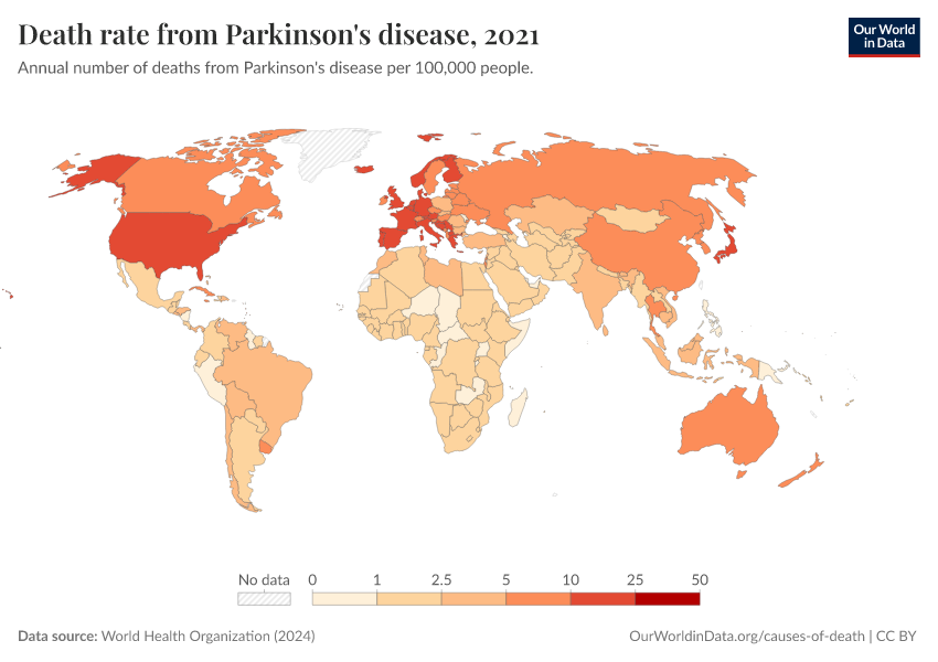 World Health Organization (2024) – with major processing by Our World in Data. “Death rate from Parkinson's disease” [dataset]. World Health Organization, “Global Health Estimates” [original data]. Retrieved March 2, 2026 from https://data-archive-fasttrack-step.owid.pages.dev:8789/20250909-093708/grapher/death-rate-from-parkinsons-disease-ghe.html (archived on September 9, 2025).