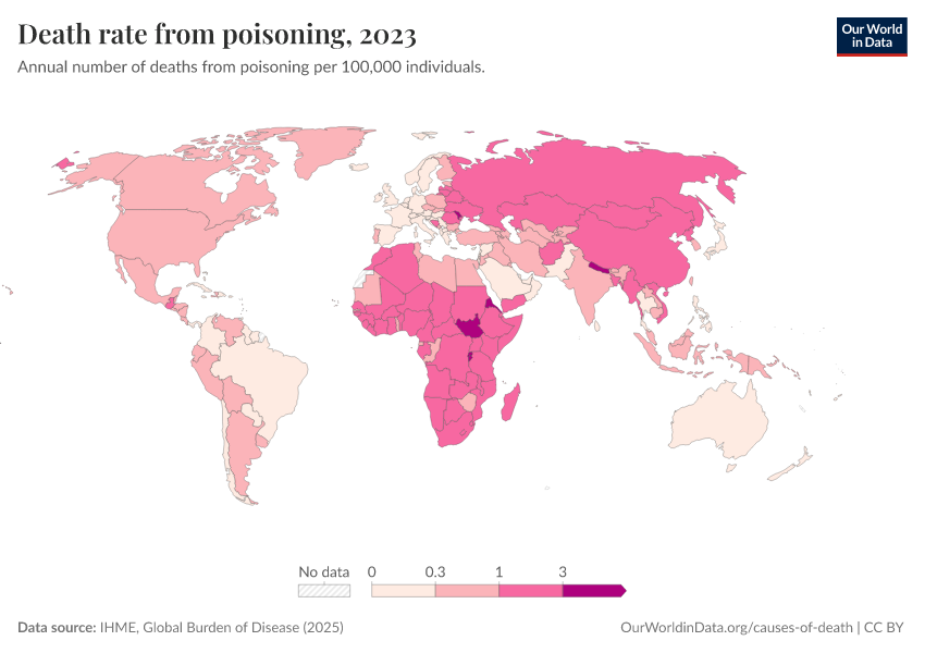 “Data Page: Death rate from poisoning”, part of the following publication: Esteban Ortiz-Ospina and Max Roser (2016) - “Global Health”. Data adapted from IHME, Global Burden of Disease. Retrieved from https://data-archive-fasttrack-step.owid.pages.dev:8789/20260211-174736/grapher/death-rate-from-poisoning-gbd.html [online resource] (archived on February 11, 2026).How to cite this data