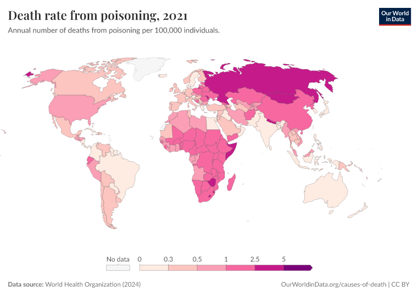 World Health Organization (2024) – with major processing by Our World in Data. “Death rate from poisoning” [dataset]. World Health Organization, “Global Health Estimates” [original data]. Retrieved March 2, 2026 from https://data-archive-fasttrack-step.owid.pages.dev:8789/20250909-093708/grapher/death-rate-from-poisoning-ghe.html (archived on September 9, 2025).