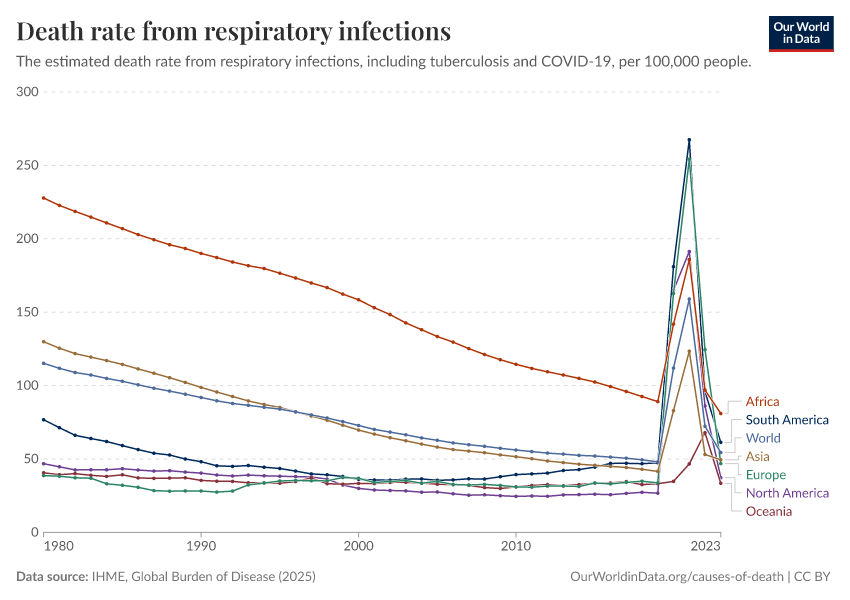 IHME, Global Burden of Disease (2025) – with major processing by Our World in Data. “Death rate from respiratory infections” [dataset]. IHME, Global Burden of Disease, “Global Burden of Disease - Deaths” [original data]. Retrieved March 2, 2026 from https://data-archive-fasttrack-step.owid.pages.dev:8789/20260211-174736/grapher/death-rate-from-respiratory-infections-gbd.html (archived on February 11, 2026).