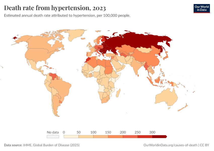 IHME, Global Burden of Disease (2025) – with major processing by Our World in Data. “Death rate from hypertension” [dataset]. IHME, Global Burden of Disease, “Global Burden of Disease - Risk Factors - Deaths” [original data]. Retrieved March 2, 2026 from https://data-archive-fasttrack-step.owid.pages.dev:8789/20260213-112438/grapher/death-rates-from-high-blood-pressure-gbd.html (archived on February 13, 2026).